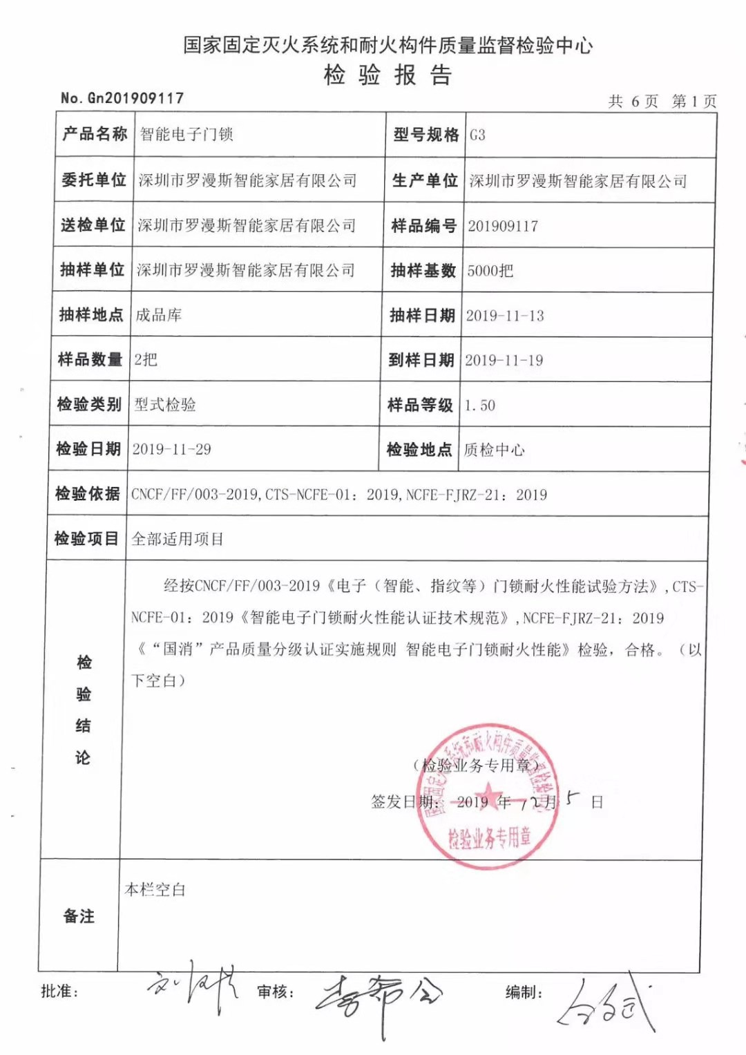 ? ?智能門鎖耐火性能檢測等檢測認證,不僅僅是防火,更體現了羅曼斯始終以客戶的根本利益為出發點,堅持向客戶及市場輸出高品質智能鎖產品、守護用戶居家安全的決心。