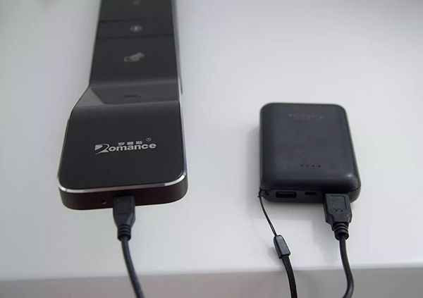 ? ? ??2、另外一種情況是指紋鎖沒電,也沒有帶鑰匙,那怎么辦?不用怕,根據行業標準,現在基本上正規公司的指紋鎖,在鎖的外側都配置了USB應急供電接口,用充電寶加上一根數據線就可以解決了。不過每個品牌不同,規格型號不同,應急接口的位置略有不同,但是都大同小異,絕大多數都在如下圖羅曼斯的這款指紋鎖下側位置。