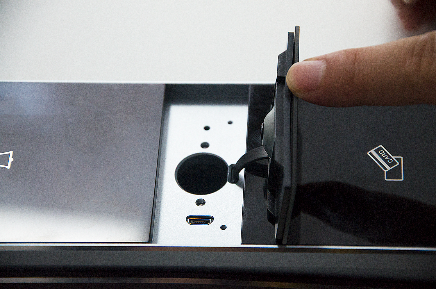 ? ? ? ?前鎖板(右)上分別有密碼識別區、門鈴按鍵、IC卡感應區、指紋感應區、logo。